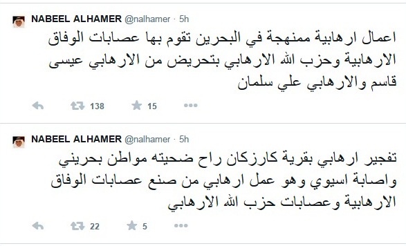 «الحمر» يتّهم «الوفاق» و«حزب الله» و«قاسم» بتفجيرات دمستان وكرزكان ساحة المنامة منامة بوست: وجّه المستشار الإعلاميّ للملك نبيل الحمر، عبر حسابه على موقع التواصل الاجتماعيّ« تويتر»، التهم إلى جمعيّة الوفاق وحزب الله اللبنانيّ، وآية الله الشيخ عيسى قاسم، وأمين عام جمعيّة الوفاق