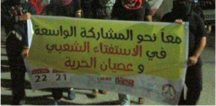 القوى الثوريّة المعارضة: الاستفتاء الشعبيّ والمقاطعة انتصرا على إرهاب النظام ساحة المنامة منامة بوست: أشادت القوى الثوريّة المعارضة، بعزيمة الشعب البحرينيّ وإرادته وتحدّيه لتهديدات السلطات البحرينيّة وإرهابها، موضحة أنّ الإرادة الشعبيّة حقّقت نجاحًا فاق جميع التوقّعات في الاستفتاء الشعبيّ