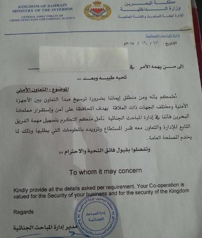 الداخليّة تطلب من التجّار العمل كمخبرين والتجسّس لصالحها ساحة المنامة منامة بوست: كشف الأمين العام للمنظّمة الأوروبيّة – البحرينيّة لحقوق الإنسان، حسين جواد برويز، عن رسالةٍ بعثتها إدارة المباحث الجنائيّة التابعة لوزارة الداخلية، إلى أصحاب المحلّات التجارية