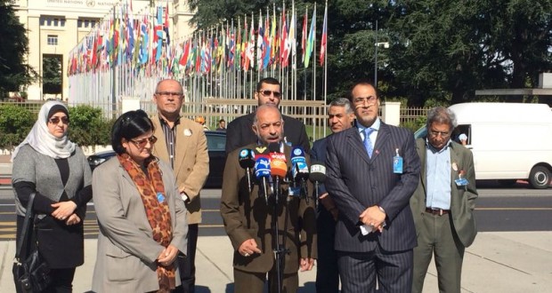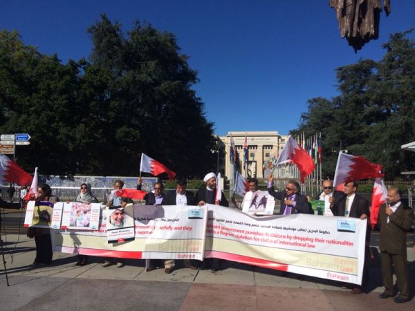 وقفة تضامنيّة أمام قصر الأمم المتحدة بجنيف احتجاجًا على تدهور الوضع الإنسانيّ بالبحرين ساحة المنامة منامة بوست (خاص): أقام الوفد الأهلي البحرينيّ الموجود بجنيف وعدد من النشطاء وأبناء الجاليات العربيّة والأجنبيّة، أمس الجمعة 12 سبتمبر/ أيلول 2014، وقفةً تضامنيّة أمام الكرسي المكسور بجوار قصر الأمم المتحدة