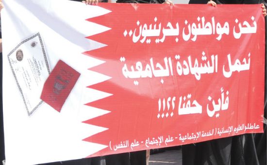 الخارجيّة الأمريكيّة: معدّل البطالة الحقيقيّ في البحرين 20% وليس 4% ساحة المنامة منامة بوست: كشف تقريرٌ اقتصاديّ صدر مؤخراً عن وزارة الخارجيّة الأمريكيّة، أنّ برنامج الأمم المتحدة الإنمائيّ (UNDP) قدّر معدّل البطالة الحقيقيّ بين البحرينيين من 15 إلى 20 في المئة، وهو ما يتعارض مع تصريحات الحكومة