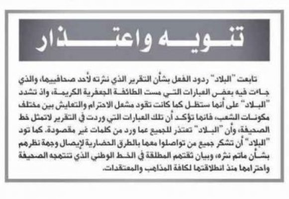 صحيفة البلاد تعتذر للطائفة الشيعيّة بعد إجبارها على ذلك ساحة المنامة منامة بوست: نشرت صحيفة البلاد – اليوم الجمعة 25 يوليو / تموز 2014، اعتذاراً رسميّاً للطائفة الشيعيّة عن المقال الذي كتبه الكاتب طارق العامر، والذي أساء فيه لها ولمقدّساتها الإسلاميّة مع كونها مكوّناً أساسيّاً