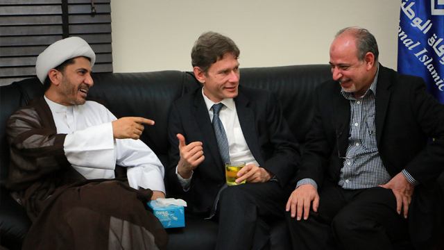 تعليقاً على استدعاء قادة المعارضة ..هيومن رايتس تطالب البحرين بإلغاء قانون لقاء دبلوماسيّين أجانب دون تصريح الحكومة ساحة المنامة منامة بوست: دعت منظمة هيومن رايتس ووتش، السلطات البحرينيّة إلى إسقاط التهم فوراً عن أمين عام جمعيّة الوفاق ومساعده السياسيّ، بعد لقائهما مع دبلوماسيّ أميركيّ في 6 يوليو/ تموز 2014