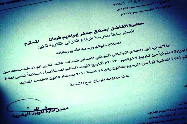 مدير الموارد البشريّة في التربية والتعليم «يفصل» معلّماً «دون علم الوزارة» ساحة المنامة منامة بوست (خاص): وجّهت وزارة التربية والتعليم في البحرين رسالة فصل من الخدمة لأحد المعلّمين من الطائفة الشيعيّة، بحجّة صدور حكمٍ سابق ضدّه من المحكمة بتهمة التجمهر في مسيرة.