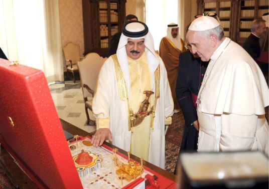 ملك البحرين يبحث نبذ «التطرّف الدينيّ» مع بابا الفاتيكان ساحة المنامة منامة بوست: التقى ملك البحرين حمد بن عيسى آل خليفة، أمس الإثنين 19 مايو / أيار 2014، بابا الفاتيكان قداسة البابا فرنسيس الأوّل، وذلك ضمن حملة العلاقات العامّة التي تسعى لتحسين صورة نظام الحكم في المنامة
