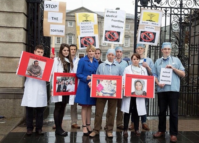 أطبّاء آيرلندا يتظاهرون تضامناً مع أطبّاء البحرين المعتقلين ساحة المنامة منامة بوست: قام عددٌ من الأطبّاء الآيرلنديين، بوقفة احتجاجيّة بمقر الكليّة الملكيّة الآيرلنديّة للجرّاحين في دبلن، أمس الخميس 8 مايو/ أيّار 2014، مندّدين بعسكرة المستشفيات والاضطّهاد الطائفيّ ضدّ الأغلبيّة المجتمعيّة