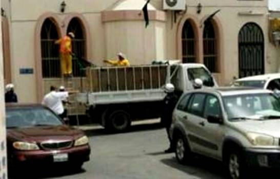 البلديّة تزيل شعارات الدينيّة في المحرّق ساحة المنامة منامة بوست: أزالت المرتزقة، صباح اليوم الثلاثاء 15 أبريل / نيسان الشعارات الدينيّة والحسينيّة عن جدران مأتم كريمي ومأتم أهل البيت.