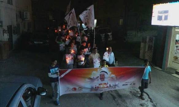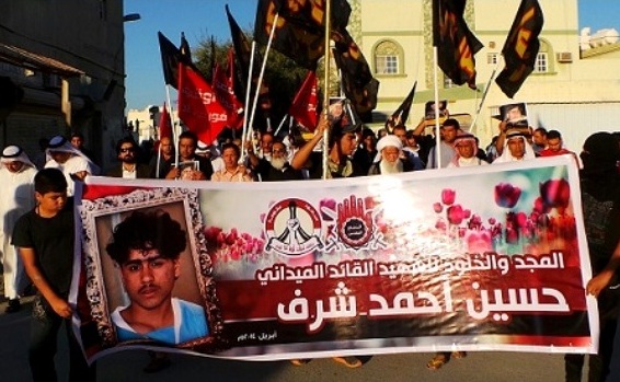 مسيرات جماهيريّة حاشدة في تأبين الشهيد شرف ساحة المنامة منامة بوست (خاص): شهدت مراسم ختام فاتحة الشهيد حسين شرف «21 عاما» ببلدة العكر، يوم أمس الأحد «6 أبريل / نيسان 2014»، توافداً جماهيراً كبيراً، بناء على دعوة وجهها ائتلاف شباب ثورة 14 فبراير