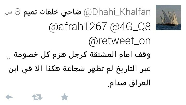 بعد جامعة البحرين.. «ضاحي خلفان» يثير غضب الكويتيّين «بتمجيد صدّام» ساحة المنامة منامة بوست (خاص): أثارت بعض تغريدات رئيس شرطة دبي ضاحي خلفان على موقع التواصل الاجتماعيّ «تويتر»، مجّد بها طاغية العراق المقبور «صدّام حسين»، موجة غضبٍ شديدة