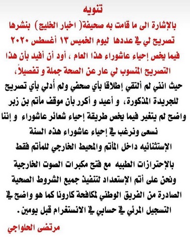 ونفى الرئيس «مرتضى الحلواجي» التصريح المنسوب له في الصحيفة عبر حسابه على موقع مشاركة الصوّر والفيديو «إنستغرام»، إنّه «بالإشارة إلى ما قامت به صحيفة «أخبار الخليج» في عددها يوم الخميس 13 أغسطس/ آب 2020، فيما يخصّ إحياء عاشوراء هذا العام، فإنّ التصريح المنسوب لي عار عن الصحّة جملةً وتفصيلًا»- بحسب تعبيره.