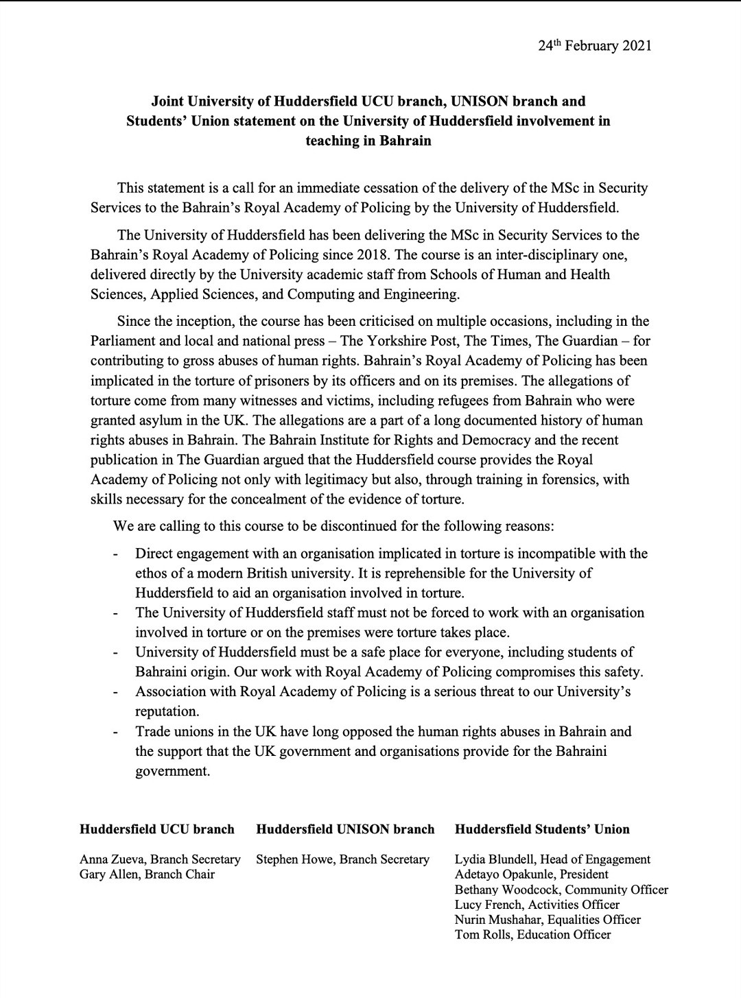 منامة بوست: وجّه اتحاد طلاب «جامعة هيدرسفيلد» وموظّفون ونقابات عماليّة رسالة إلى إدارة الجامعة، طالبوا فيه بوقف دورة الماجستير التي تديرها في الأكاديميّة الملكيّة للشرطة في البحرين، المتّهمة بارتكاب انتهاكات لحقوق الإنسان.