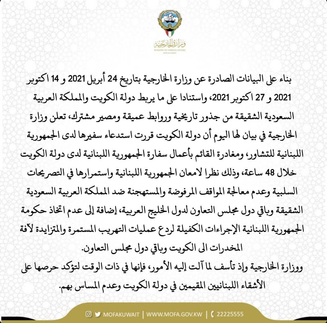 وأكّدت وزارة الخارجيّة الكويتيّة في بيانٍ، أنّ الكويت قرّرت استدعاء سفيرها لدى الجمهوريّة اللبنانيّة للتشاور، ومغادرة القائم بأعمال سفارة الجمهوريّة اللبنانيّة لدى دولة الكويت خلال «48 ساعة».