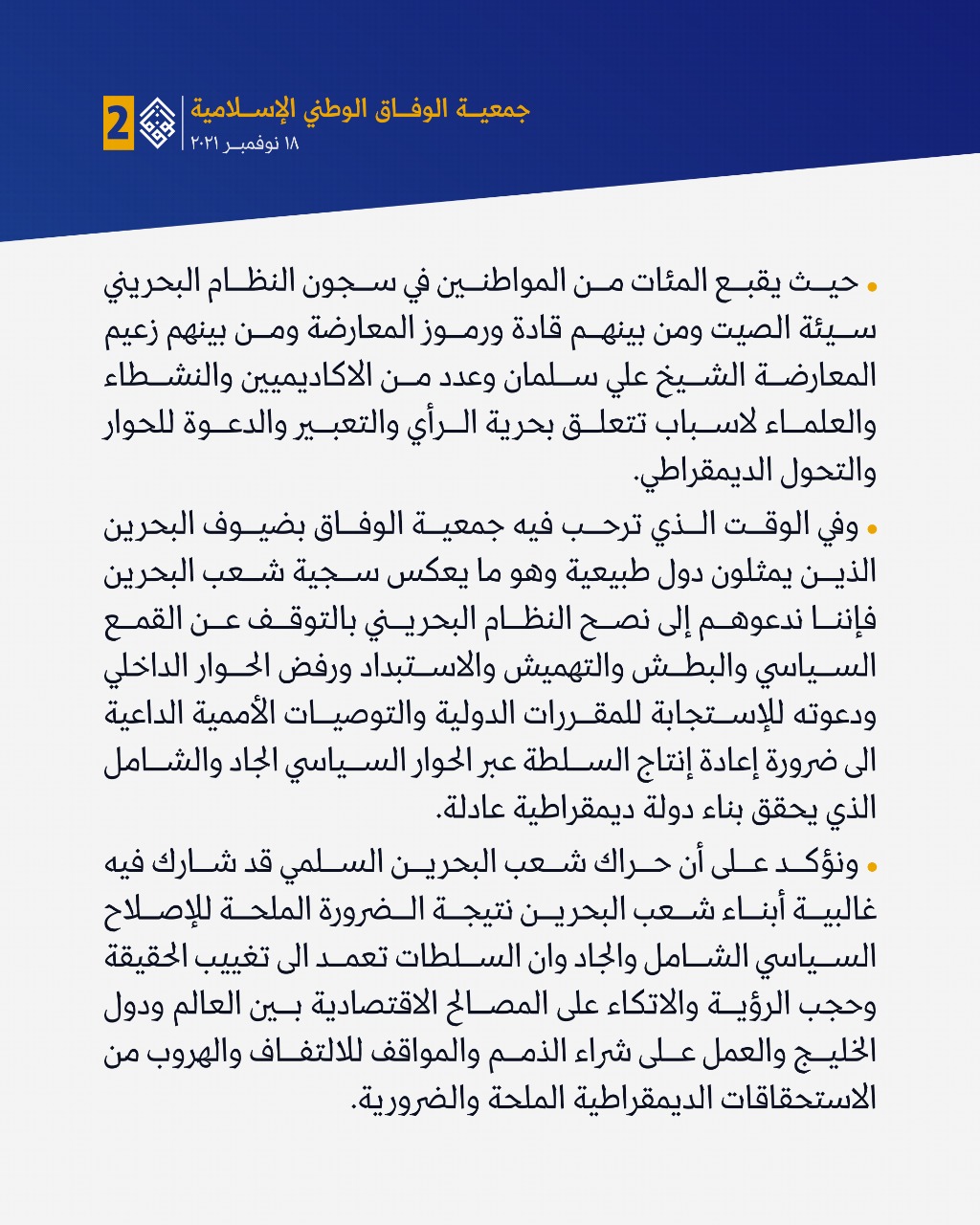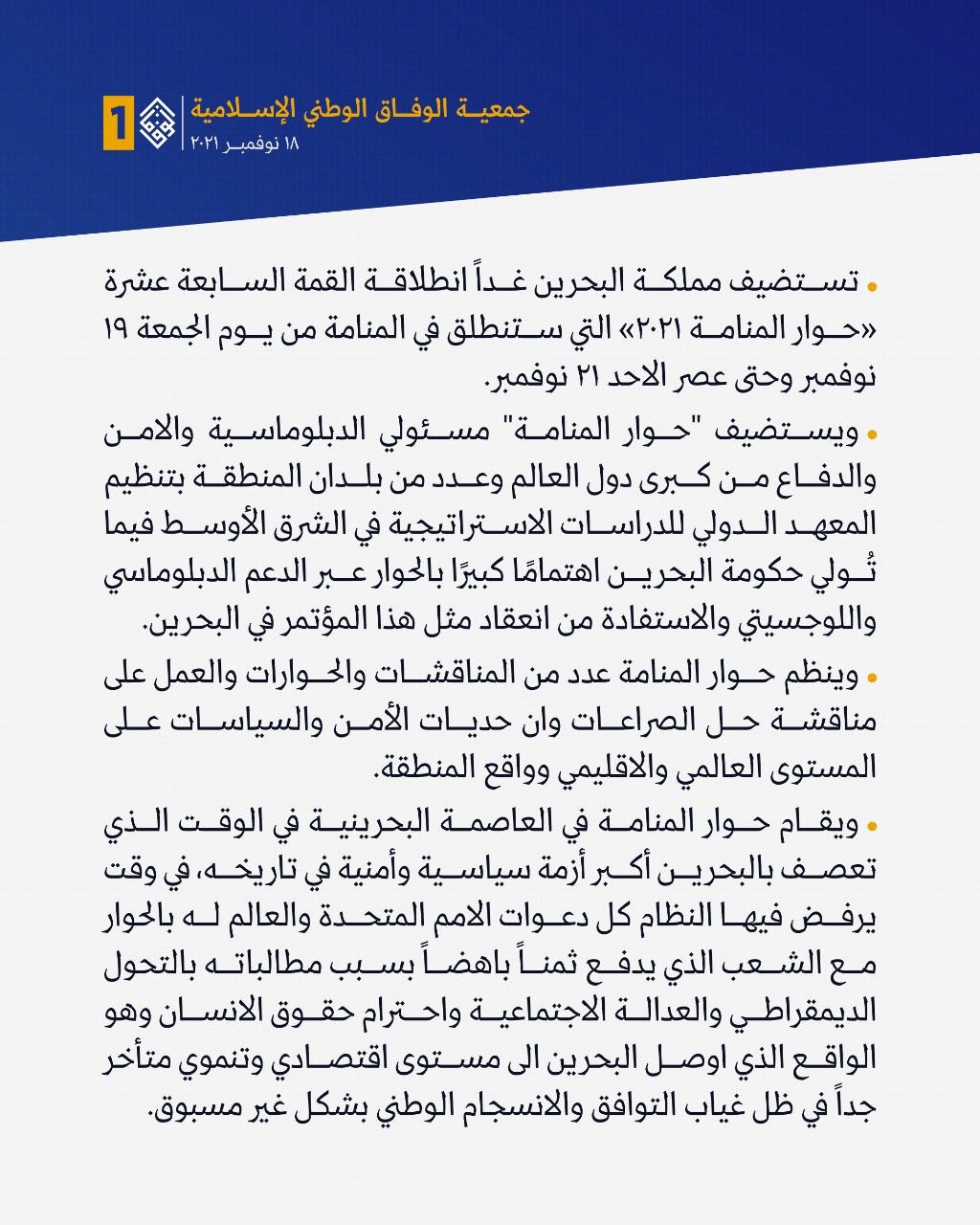 وقالت الجمعيّة في بيانٍ لها إنّ «حوار المنامة»، يأتي في الوقت الذي تعصف بالبحرين أكبر أزمة سياسيّة وأمنيّة في تاريخه، ويرفض النّظام كلّ دعوات «الأمم المتّحدة» والعالم له بالحوار مع الشّعب، الذي يطالب بالتحوّل الديمقراطيّ والعدالة الاجتماعيّة واحترام حقوق الإنسان، وهو ما أوصل المملكة إلى مستوى اقتصاديّ وتنمويّ متأخّر، في ظلّ غياب التوافق والانسجام الوطنيّ» – بحسب تعبيرها.