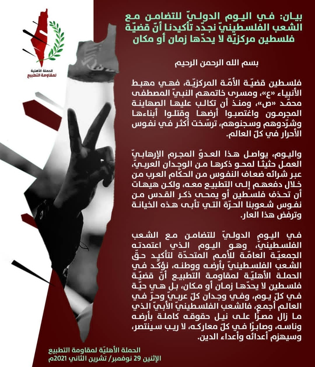 وقالت الحملة في بيانٍ لها بمناسبة اليوم الدوليّ للتضامن مع الشّعب الفلسطينيّ، إنّ «فلسطين هي مهبط الأنبياء «عليهم السلام»، ومسرى خاتمهم النبيّ المصطفى محمّد «ص»، ومنذ أن تكالب عليها الصّهاينة المجرمون، واغتصبوا أرضها وقتلوا أبناءها وشرّدوهم وسجنوهم، ترسّخت أكثر في نفوس الأحرار في كلّ العالم».