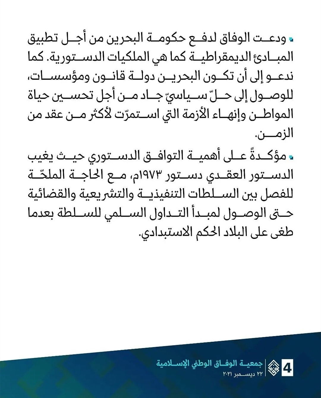 ودعت الجمعيّة إلى دفع حكومة البحرين، لتطبيق المبادئ الديمقراطيّة كما هي الملكيات الدستوريّة، وأن تكون البحرين دولة قانون ومؤسّسات، للوصول إلى حلٍّ سياسيّ جاد لتحسين حياة المواطن، وإنهاء الأزمة التي استمرّت لأكثر من عقدٍ من الزمن.