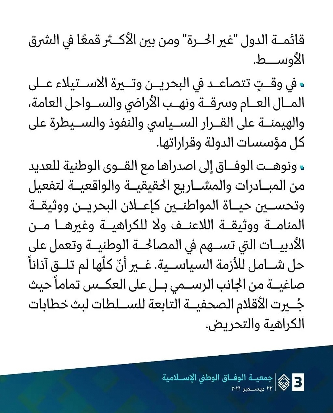 ولفتت إلى أنّه وحسب المؤشّرات الدوليّة؛ تُعتبر البحرين دولة موغلة في الفساد العام والفساد السياسيّ والماليّ والتشريعيّ والقضائيّ، كما صنّفتها جهات دوليّة في تقاريرها؛ أبرزها «منظّمة الشّفافية الدوليّة» التي وصفت المملكة كواحدةٍ من عدّة أنظّمة «وحشيّة وقمعيّة»، وكذلك «مجلة الإيكونومست» التي شبّهتها بالبلد التسلّطي الاستبداديّ، كما أدرجتها مؤسّسة «فريدوم هاوس» ضمن قائمة الدّول «غير الحرّة»، ومن بين الأكثر قمعًا في الشّرق الأوسط – على حدّ تعبيرها.