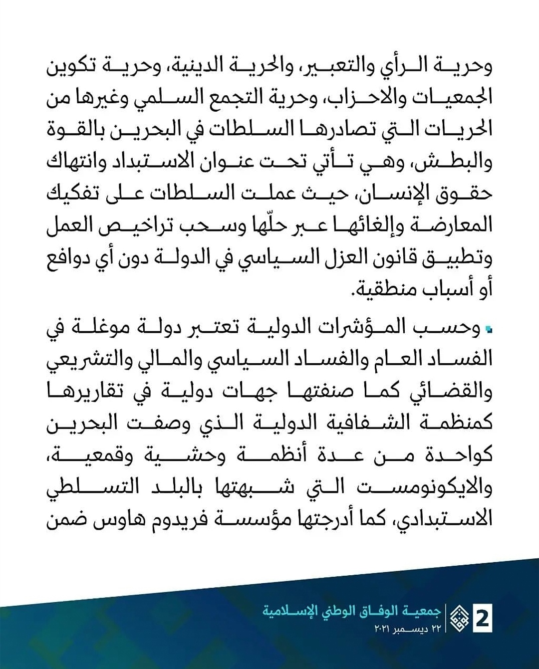 وأضافت أنّ «الشّعب البحرينيّ ممنوع من المشاركة السياسيّة، وتوزيع الثّروة والتشريع والتنفيذ والقضاء، ومحجوب عنه الحقوق السياسيّة، وحريّة الرأي والتعبير، والحريّة الدينيّة، وحريّة تكوين الجمعيات والأحزاب، وحريّة التجمّع السلميّ وغيرها من الحريّات، التي تصادرها السّلطات في البحرين بالقوّة والبطش، والتي تأتي بعنوان «الاستبداد وانتهاك حقوق الإنسان» – على حدّ وصفها.