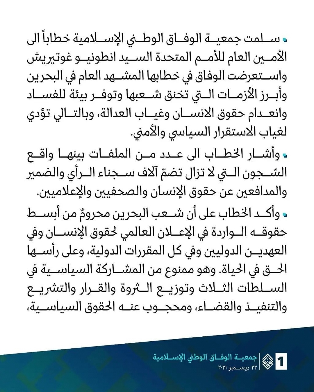 منامة بوست: سلّمت جمعيّة الوفاق الوطنيّ الإسلاميّة المعارضة، خطابًا إلى الأمين العام للأمم المتّحدة «أنطونيو غوتيريش»، واستعرضت فيه المشهد العام في البحرين.