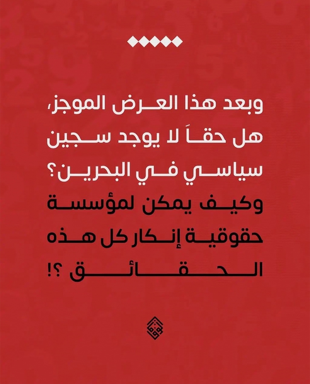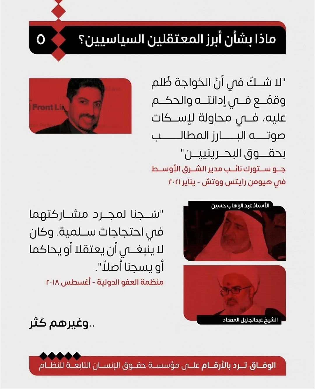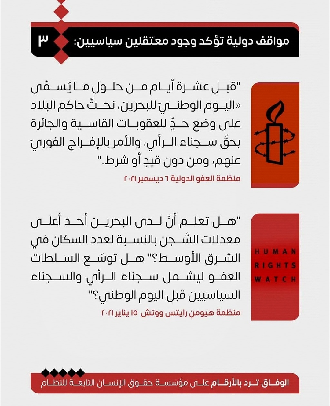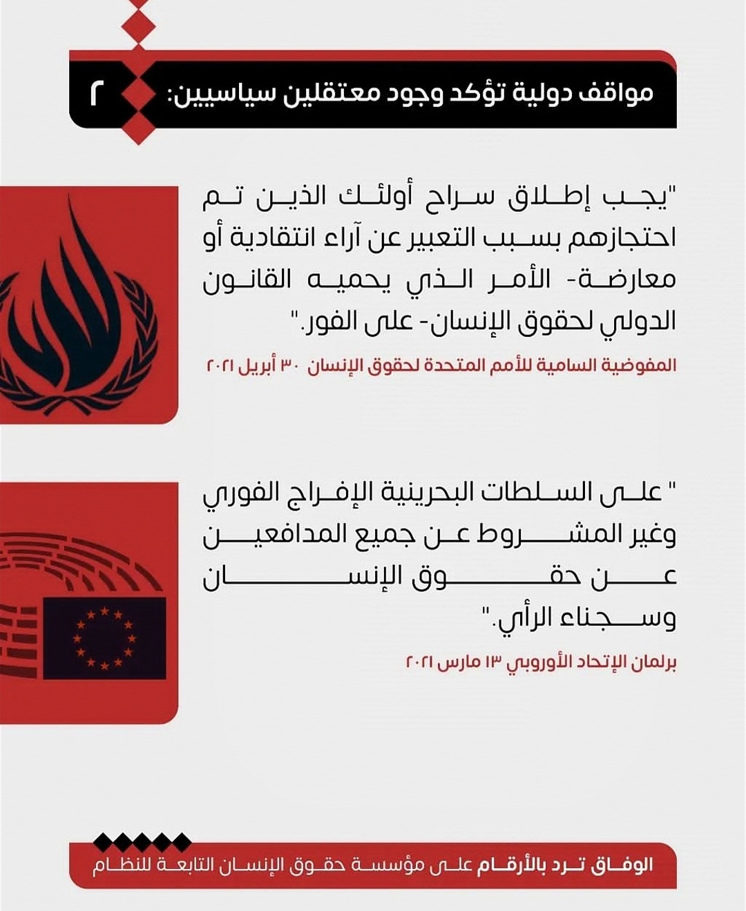 وأشارت إلى مجموعةٍ من التقارير الدوليّة، التي تؤكّد وجود معتقلين سياسيين في سجون البحرين، إضافة إلى مطالبة المفوضيّة الساميّة للأمم المتّحدة لحقوق الإنسان، بالإفراج عن المعتقلين بسبب التعبير عن آرائهم الانتقاديّة أو المعارضة، وذلك في 30 أبريل/ نيسان 2021، باعتباره أمر يحميه القانون الدوليّ لحقوق الإنسان.
