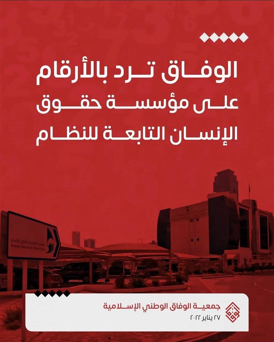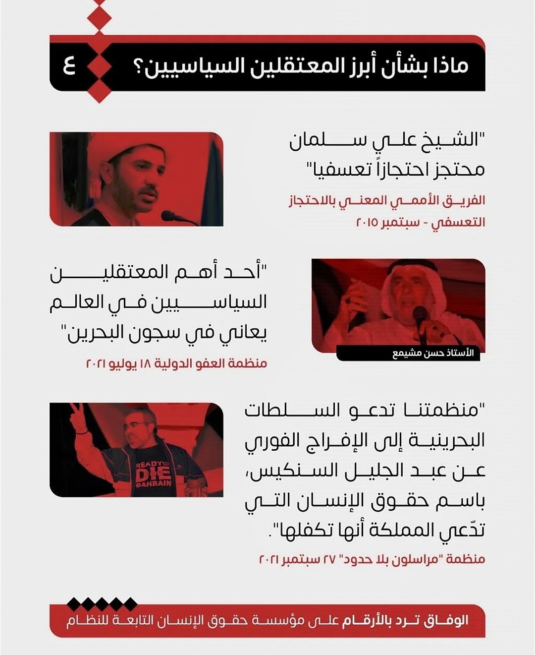 وعبّرت جمعيّة الوفاق عن استغرابها؛ من محاولات المؤسّسة الوطنيّة لحقوق الإنسان – «مؤسّسة رسميّة»، إنكار هذه الحقائق ونفيها المتكرّر بعدم وجود سجناء سياسيين في البحرين.