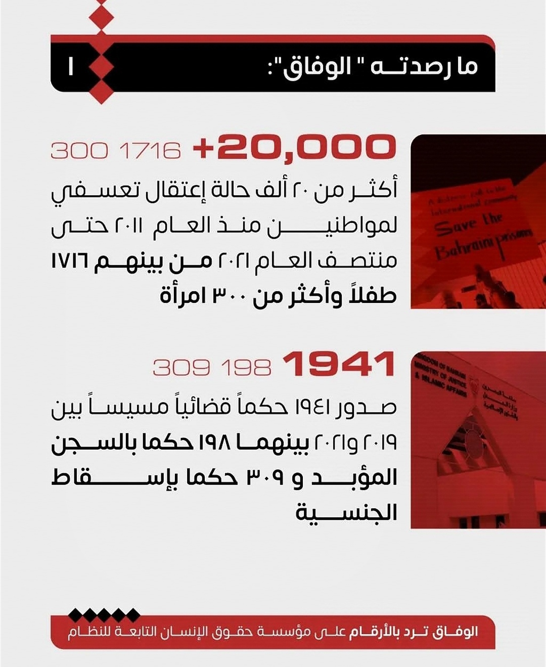 جمعيّة الوفاق المعارضة: «أكثر من 20 ألف حالة اعتقال تعسفيّ خلال العقد الماضي من بينهم أكثر من ألفيْن طفل وامرأة»
