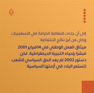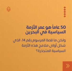 وأشارت إلى أنّه في 26 أغسطس/ آب 1975، أصدر أمير البحرين حينها المرسوم الأميريّ «رقم 14» بحلّ المجلس الوطنيّ، إلى أن جاءت انتفاضة الكرامة في التسعينيات، وكان من أبرز نتائجها ميثاق العمل الوطنيّ في 14 فبراير/ شباط 2001، مبشّرًا بإحياء التجربة الديمقراطيّة – على حدّ قولها.