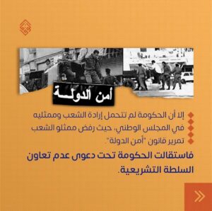 وأضافت أنّ حكومة البحرين لم تتحمّل إرادة الشّعب وممثّليه في المجلس الوطنيّ، إذ رفض ممثّلو الشّعب تمرير«قانون أمن الدولة»، ما أدّى إلى استقالة الحكومة تحت دعوى عدم تعاون السّلطة التشريعيّة.
