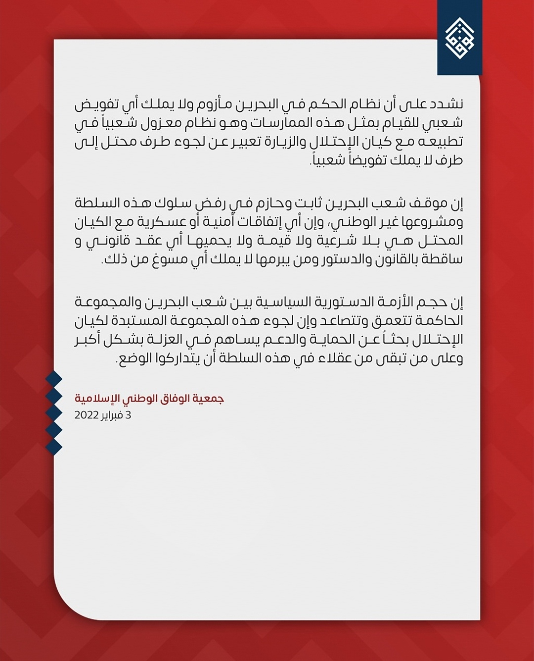 وقالت الجمعيّة في بيانٍ لها، إنّ «موقف شعب البحرين ثابت وحازم في رفض سلوك هذه السّلطة ومشروعها غير الوطنيّ، وأنّ أيّ إتفاقات أمنيّة أو عسكريّة مع الكيان المحتل، هي بلا شرعيّة ولا قيمة لها ولا يحميها أيّ عقدٍ قانونيّ، كما أنّها ساقطة بالقانون والدّستور، ومن يبرمها لا يملك أيّ مسوّغ لذلك» – حسب تعبيرها.