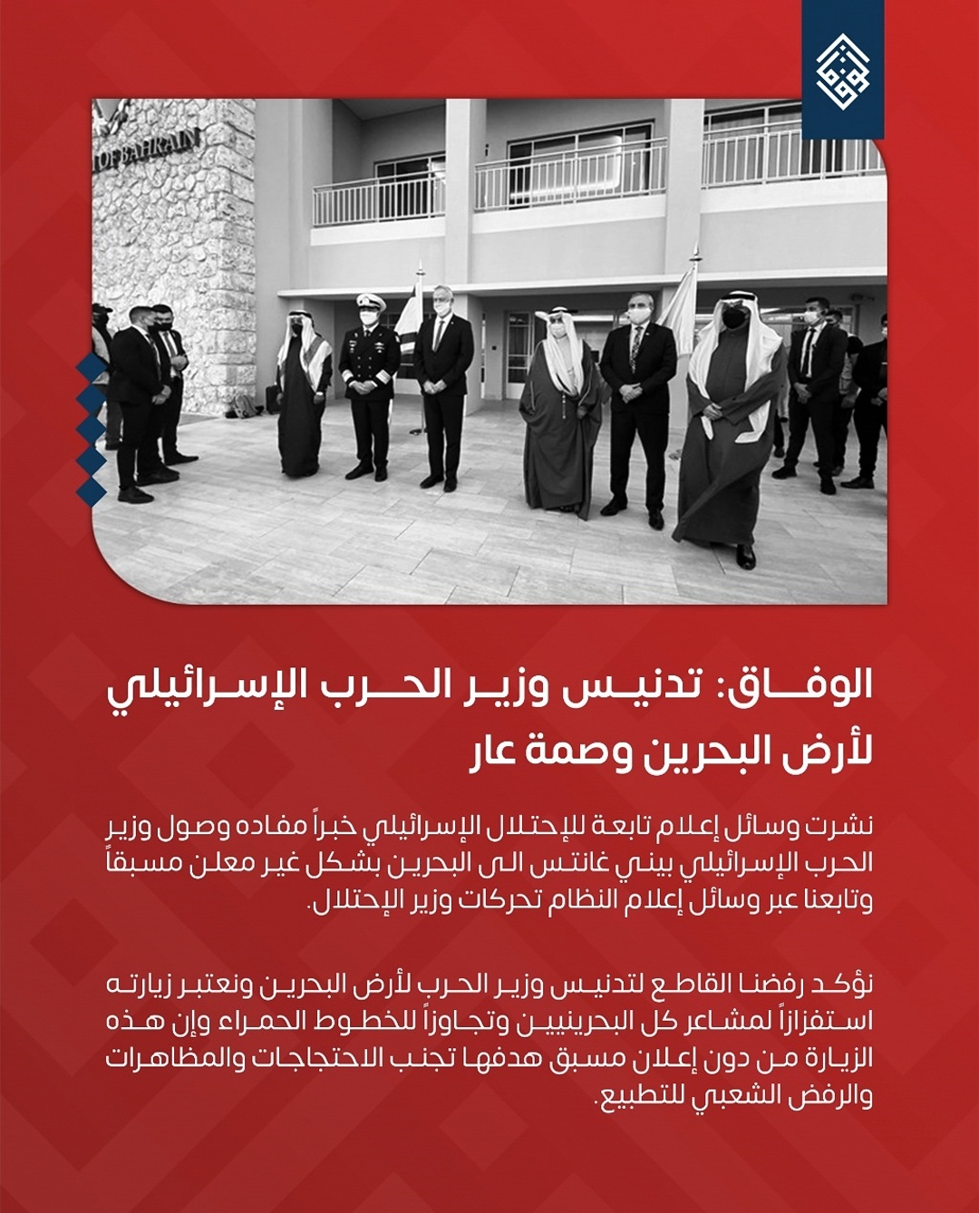 وأضافت أنّ زيارة وزير الحرب الصهيونيّ إلى البلاد، تُشكّل استفزازًا لمشاعر البحرينيين وتجاوزًا للخطوط الحمراء، وقد جاءت من دون إعلانٍ مسبقٍ بهدف تجنّب الاحتجاجات والمظاهرات والرفض الشعبيّ للتطبيع».