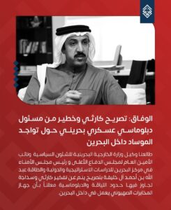 منامة بوست: وصفت جمعيّة الوفاق الوطنيّ الإسلاميّة المُعارضة، تصريح وكيل وزارة الخارجيّة البحرينيّة للشؤون السياسيّة ونائب الأمين العام لمجلس الدّفاع الأعلى «عبدالله أحمد الخليفة»، حول وجود جهاز الاستخبارات الصهيونيّ «الموساد» داخل البحرين بالكارثيّ.