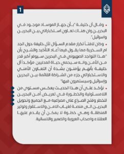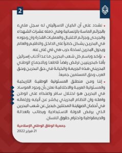 وشدّدت على أنّ الكيان الصهيونيّ يملك سجلًا مليئًا بالجرائم الإنسانيّة، وفي ذمّته عشرات الشّهداء والجرحى وجرائم الاغتيال والعمليات القذرة، ووجوده في البحرين يشكّل خطرًا على الدّاخل والإقليم والعالم، ويحوّل البحرين لساحة حربٍ هي في غنى عنها» – وفق البيان.
