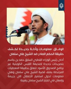 وقالت الوفاق في بيانٍ لها، إنّ ما أدلى به رئيس الوزراء القطريّ السّابق «حمد بن جاسم»، لصحيفة «القبس الكويتيّة» عبر برنامج «الصّندوق الأسود»، من تصريحاتٍ تتعلّق بحقيقة المعطيات المرتبطة بملفّ قضيّة «الشّيخ علي سلمان»، هي معلومات تحوّل استمرار الاعتقال إلى جريمةٍ وإمعانٍ في اعتبار «الشّيخ سلمان» رهينة – على حدّ وصفها.