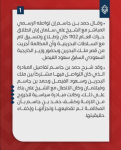 وأشارت إلى ما قاله المسؤول القطريّ السابق، بأنّ تواصله الرسميّ المباشر مع «الشّيخ سلمان» إبّان انطلاق حراك العام 2011، كان باطّلاعٍ وتنسيقٍ مع السّلطات البحرينيّة، وأنّ المكالمة أُجريت من قصر حاكم البحرين «حمد عيسى الخليفة»، وبحضور وزير الخارجيّة السّعوديّ السّابق «سعود الفيصل»، وكانت مبادرة سياسيّة للخروج من الأزمة.
