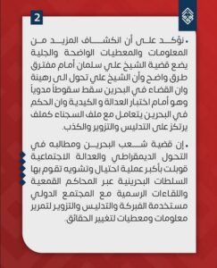 وشدّدت على أنّ قضيّة شعب البحرين، ومطالبه في التحوّل الديمقراطيّ والعدالة الاجتماعيّة قوبلت بأكبر عمليّة احتيالٍ وتشويهٍ من قبل السّلطات، وعبر المحاكم القمعيّة واللقاءات الرسميّة مع المجتمع الدوليّ، باستخدام التدليس والتزوير لتمرير معلوماتٍ ومعطياتٍ لتغيير الحقائق.