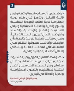 وأكّدت الوفاق أنّ مطالب الشّعب واضحة وليست قابلة للتحايل، وتتركّز في بناء دولةٍ ديمقراطيّةٍ عادلةٍ، تعتمد التعدديّة السياسيّة والتنوّع والحريّة والعدالة الاجتماعيّة، وترفض الاستبداد والقمع والوحشيّة والفساد والفوضى التي تنتهجها السّلطات حاليًا، وهي مطالب محليّة بحرينيّة خالصة، وشدّدت على أنّ أيّ مراوغاتٍ وأكاذيب يُسوّقها النّظام، هي للالتفاف على المطالب العادلة، ولا تنطلي إلا على أعداء الديمقراطيّة والحريّة – بحسب البيان.