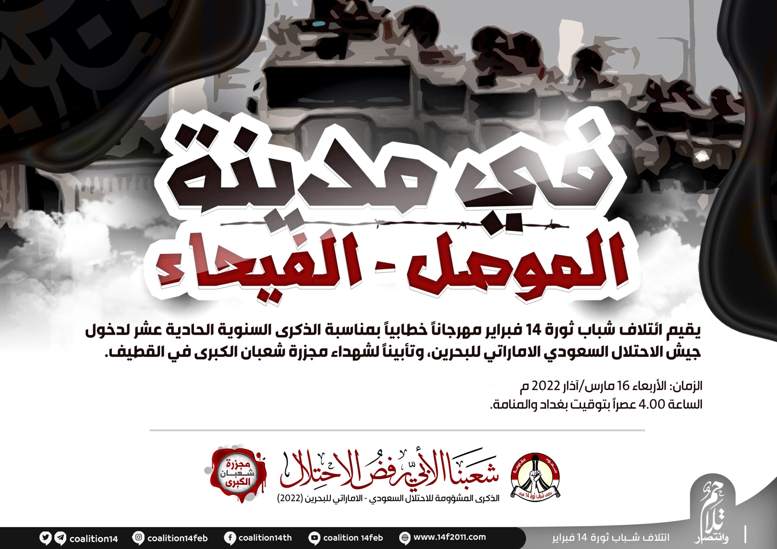 منامة بوست: أعلن ائتلاف شباب 14 فبراير عن تنظيم مهرجانٍ خطابيّ في «مدينة الموصل» العراقيّة، بالتّزامن مع الذكرى السنويّة الحادية عشرة لدخول القوّات العسكريّة «السعوديّة – الإماراتيّة»، لقمع الاحتجاجات الشعبيّة في البحرين منتصف مارس/ آذار 2011.
