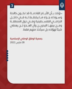 وقالت الجمعيّة في بيانٍ لها؛ إنّ «الأيام القادمة قد تكون سوداء؛ جرّاء ما يُخطّط له في داخل الأراضي الفلسطينيّة وفي دول المنطقة ومن بينها البحرين، وأنّ العدوّ لن يعطي شيئًا لهؤلاء، بل سيأخذ منهم فقط».