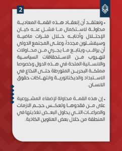 وأشارت إلى أنّ انعقاد هذه القمّة المُعادية؛ محاولة لاستكمال ما فشل فيه كيان الاحتلال وأذنابه خلال فترات ماضية، وأنّها محاولة لإضفاء المشروعيّة على من فقدوها، وتعكس حجم الأزمات والصّراعات، التي يحاول البعض تغذيتها في المنطقة من خلال بعض العناوين الكاذبة – حسب وصفها.