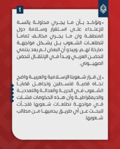 ولفتت إلى أنّ ما يجري محاولة يائسة للاعتداء على استقرار وسلامة دول المنطقة، وأنّ ما يجري مخالف لتطلّعات الشّعوب، ويُشكّل مواجهةً صارخةً لهم، ويبدو أنّ البعض لم يعد ينتمي للحضن العربيّ، وبدأ في الانتقال للحضن الصهيونيّ» – وفق البيان.