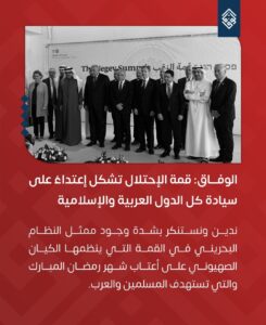 منامة بوست: أدانت جمعيّة الوفاق الوطنيّ الإسلاميّة المُعارضة، وجود ممثّلٍ للنّظام الحاكم في البحرين، في القمّة التي ينظّمها الكيان الصهيونيّ على أعتاب شهر رمضان المبارك، والتي تستهدف المسلمين والعرب.