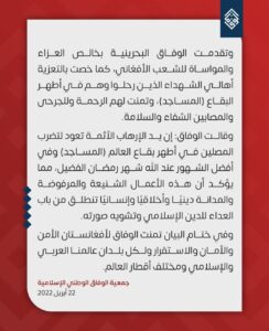 وقالت الوفاق في بيانٍ لها يوم الجمعة 22 أبريل/ نيسان 2022، إنّ «يد الإرهاب الآثمة تعود لتضرب المصلّين في أطهر بقاع العالم – «المساجد»، وفي أفضل الشّهور عند الله شهر رمضان الفضيل، ما يؤكّد أنّ هذه الأعمال الشّنيعة والمرفوضة، والمُدانة دينيًا وأخلاقيًا وإنسانيًا تنطلق من باب العداء للدّين الإسلاميّ وتشويه صورته».
