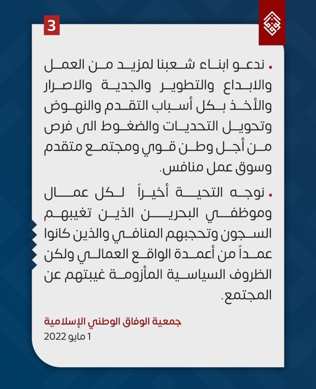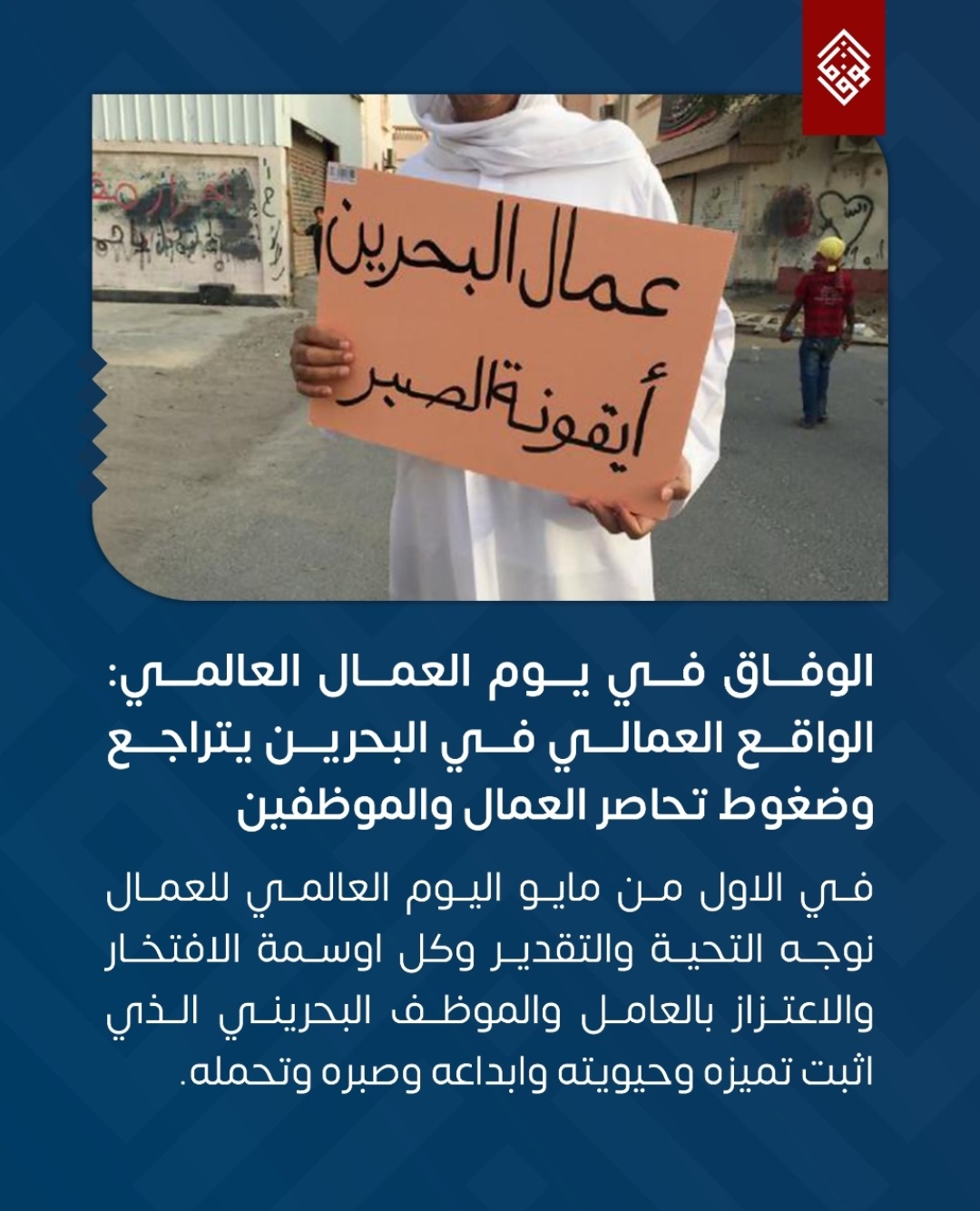 منامة بوست: وجّهت جمعيّة الوفاق الوطنيّ الإسلاميّة المُعارِضة التحيّة والتقدير، لكلّ العُمّال والموظّفين البحرينيين، الذين أثبتوا تميّزهم وحيويّتهم وإبداعهم وصبرهم وتحمّلهم، وكذلك المغيّبين منهم في السّجون، والذين تحجبهم المنافي، وكانوا من أعمدة الواقع العماليّ في المجتمع.