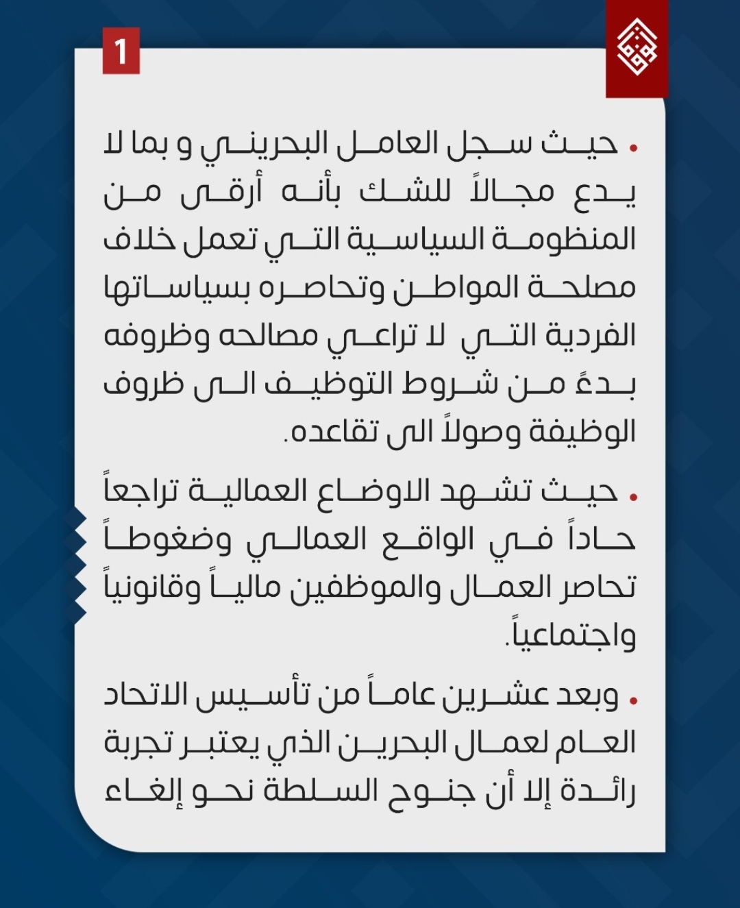 وأضافت أنّه بعد عشرين عامًا من تأسيس «الاتحاد العام لعمّال البحرين»، جنحت السّلطة نحو إلغاء وتهميش كلّ ما يعبّر عن الرأي الآخر، وشمل ذلك مزيدًا من الإجراءات والقوانين المهمِّشة للعامل وأرباب العمل البحرينيين – على حدّ وصفها.
