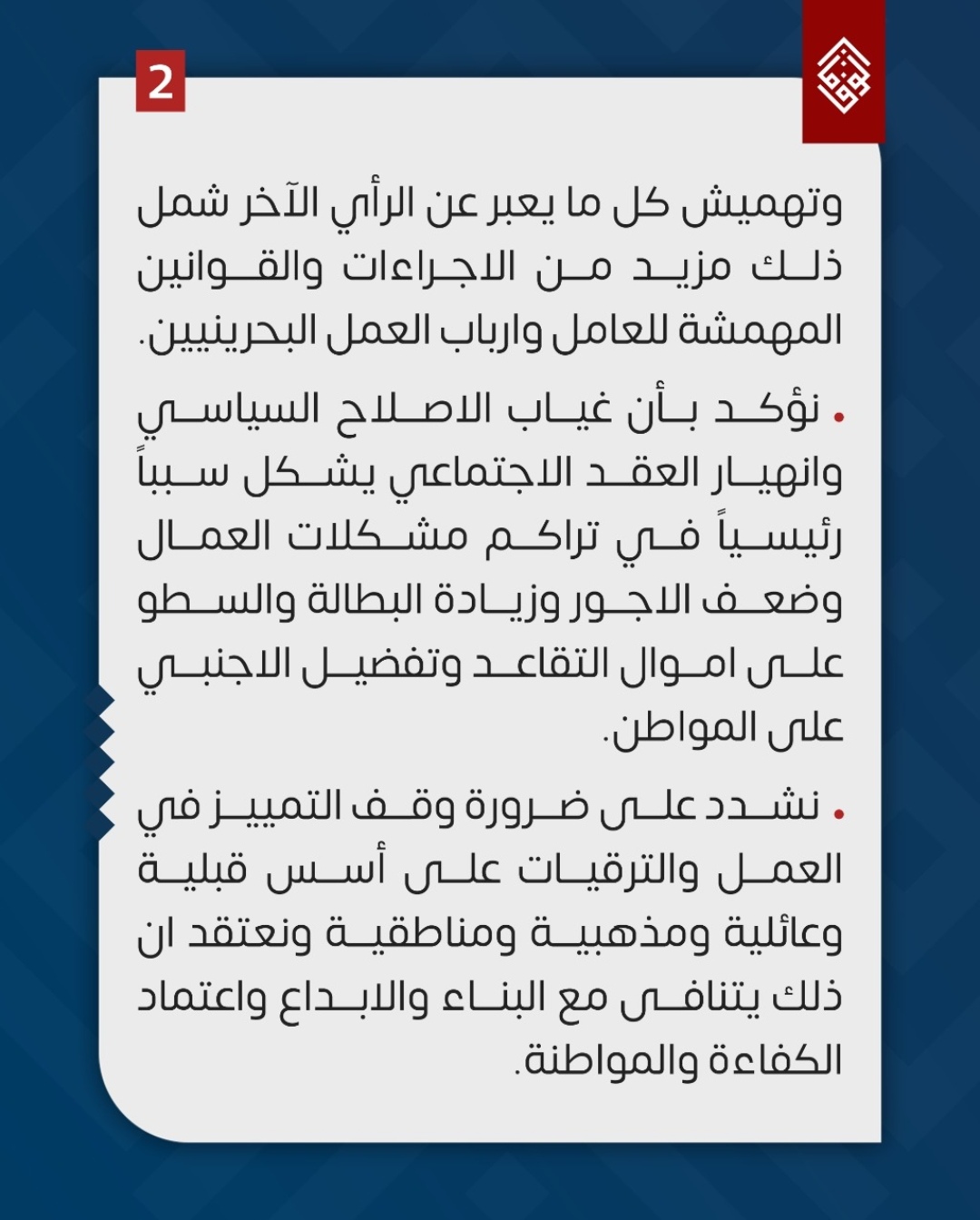 وأكّدت أنّ غياب الإصلاح السياسيّ وانهيار العقد الاجتماعيّ، يُشكّل سببًا رئيسيًا في تراكم مشكلات العمّال، وضعف الأجور وزيادة البطالة والسطو على أموال التقاعد، وتفضيل الأجنبيّ على المواطن.