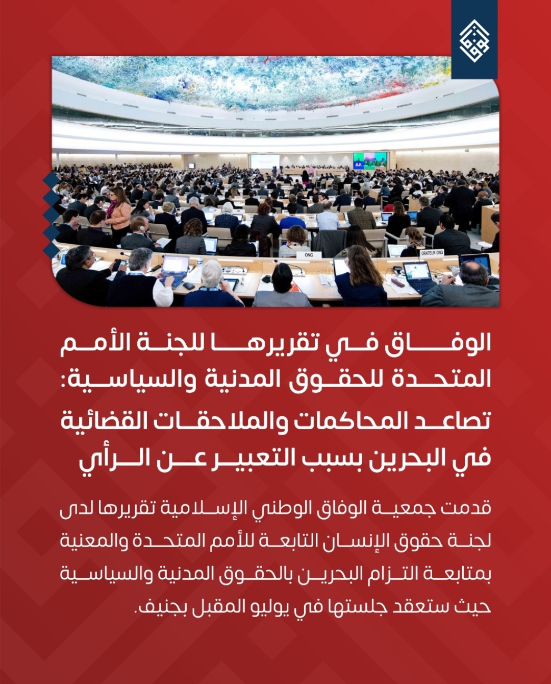 منامة بوست: قدّمت جمعيّة الوفاق الوطنيّ الإسلاميّة المُعارضة، تقريرها لدى لجنة حقوق الإنسان التابعة للأمم المتّحدة، والمعنيّة بمتابعة التزام البحرين بالحقوق المدنيّة والسياسيّة، والتي ستعقد جلستها في يوليو/ تموز المقبل بجنيف.
