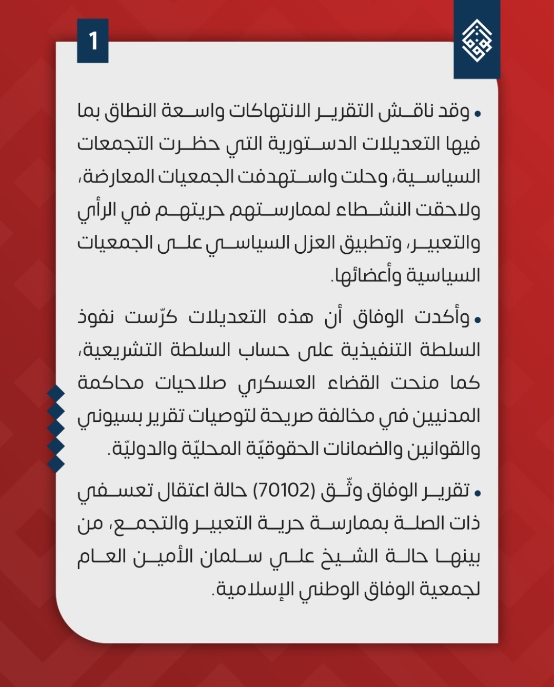 وأشارت إلى أنّها وثّقت «20107» حالة اعتقال تعسفيّ، ذات الصّلة بممارسة حريّة التعبير والتجمّع، من بينها حالة الأمين العام لجمعيّة الوفاق «الشّيخ علي سلمان».