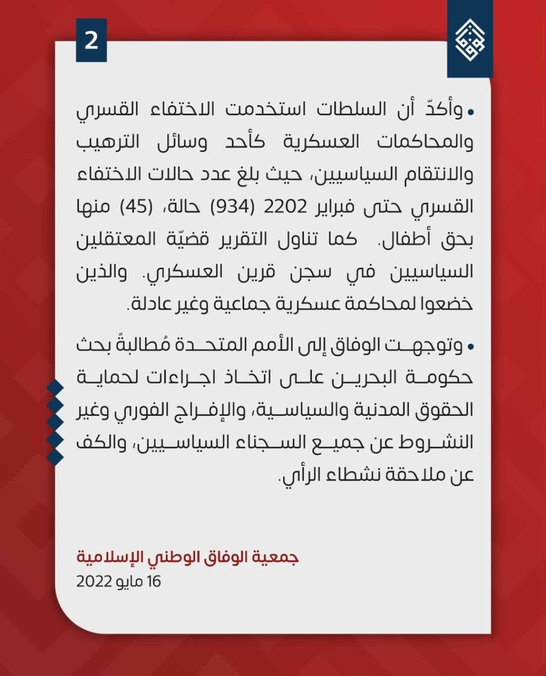 وطالبت الوفاق الأمم المتّحدة بالضّغط على حكومة البحرين، لاتخاذ إجراءات لحماية الحقوق المدنيّة والسياسيّة، والإفراج الفوريّ وغير المشروط عن جميع السّجناء السّياسيين، والكفّ عن ملاحقة نشطاء الرأي – وفق التقرير.