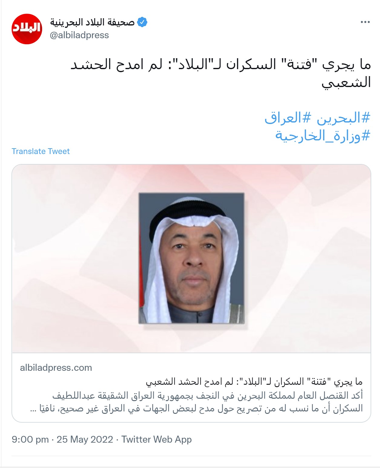 منامة بوست (خاص): نفى القنصل العام للبحرين في مدينة النجف الأشرف العراقيّة «عبداللطيف السّكران»، ثناءه على الحشد الشعبيّ العراقيّ، في تصريحاتٍ لصحيفةٍ محليّة، فيما أقدمت الصحيفة على حذف خبر النفي لاحقًا من موقعها وحساباتها الرسميّة.