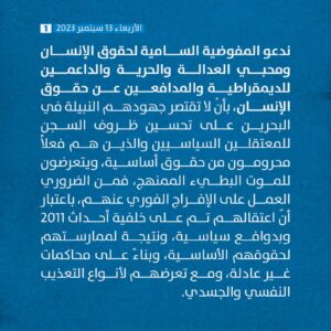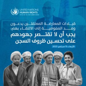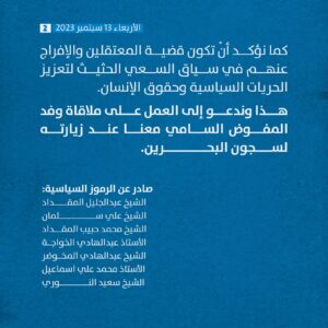 وطالبوا بأن تكون قضيّة المعتقلين والإفراج عنهم، في سياق السّعي الحثيث لتعزيز الحريّات السياسيّة وحقوق الإنسان، وحثّوا على العمل على ملاقاة وفد المفوّض السّامي عند زيارته لسجون البحرين.