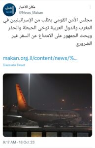 وأشار «موقع كان العبريّ» إلى أنّ مجلس الأمن القوميّ للكيان المحتل، طالب المستوطنين الصّهاينة في المغرب والدّول العربيّة المطبّعة بتوخّي الحيطة والحذر، وحثّهم على الامتناع عن السّفر غير الضّروريّ – حسب تعبيرها.